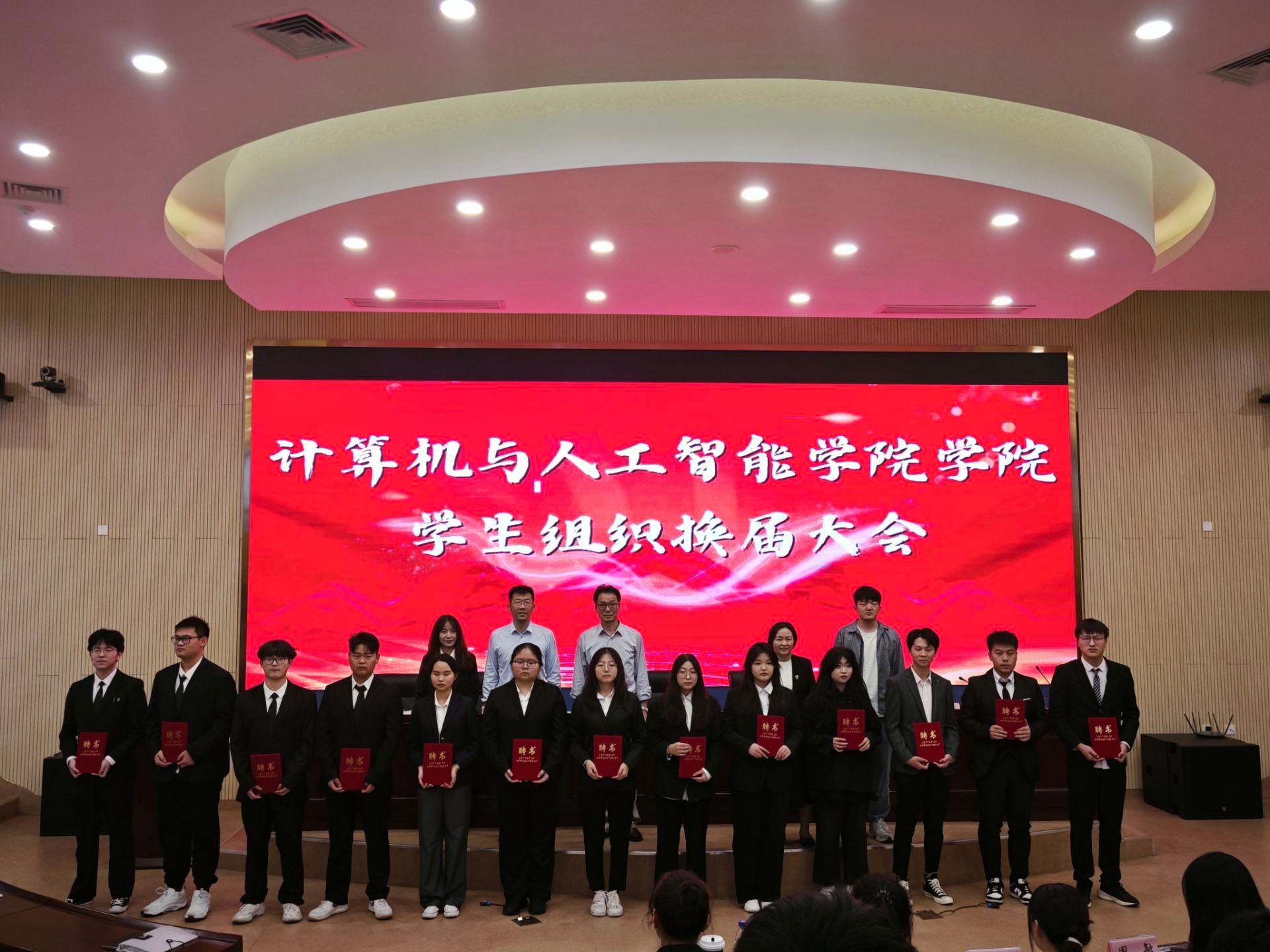 会议宣读新一届学生组织工作人员名单,为学生组织工作人员代表颁发聘书。新入职学生组织工作人员代表徐琦发言表达自己的想法及对未来工作的展望,上一届学生会执行主席李柔总结以往经验并对新一届工作人员提出希望和寄语。