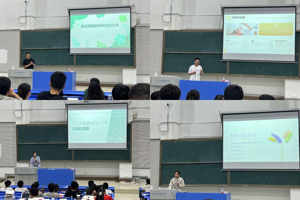分享会上,七位优秀学生结合自身考研和考公经历,围绕心态调整、院校和专业选择、学习计划制定、考研考公时间分配、公共课和专业课备考及学习资料推荐等方面,详细分享了成功经验和注意事项,尤其介绍了在目前的就业环境下,如何坚持到底,稳定心态,取得胜利。
