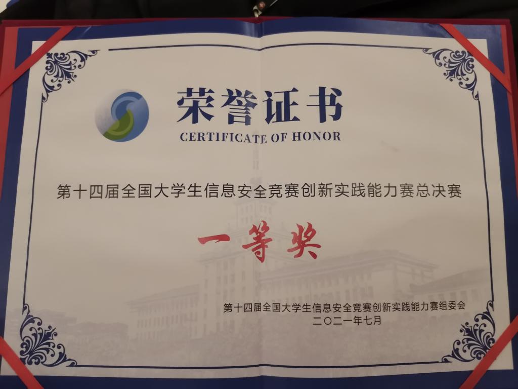 近日,第十四届全国大学生信息安全竞赛-创新实践能力赛”全国总决赛在哈尔滨落下帷幕。来自我院计算机学院的高星雨、唐端端、周鹏辉和陈浩同学组成EDI战队首次代表我院参加该项赛事,并以总分5369分的成绩荣获一等奖,冯玉婷老师作为该队指导老师荣获 “优秀指导老师奖”,队长高星雨在Build赛项中设计的参赛试题以排名第四的成绩获得“创新实践设计奖”。