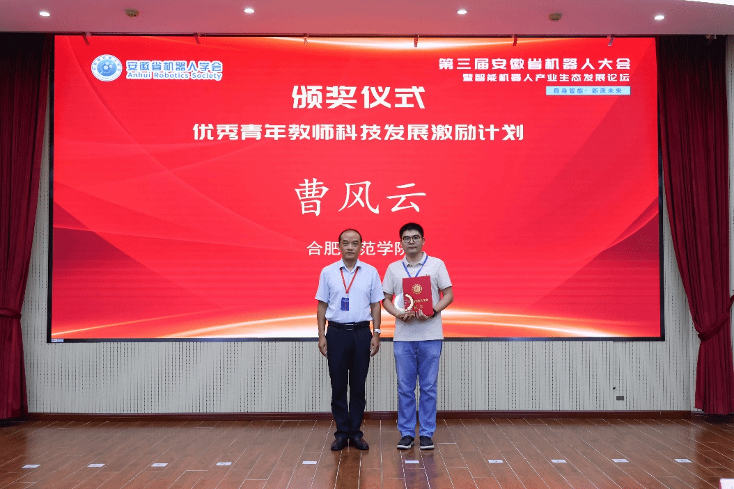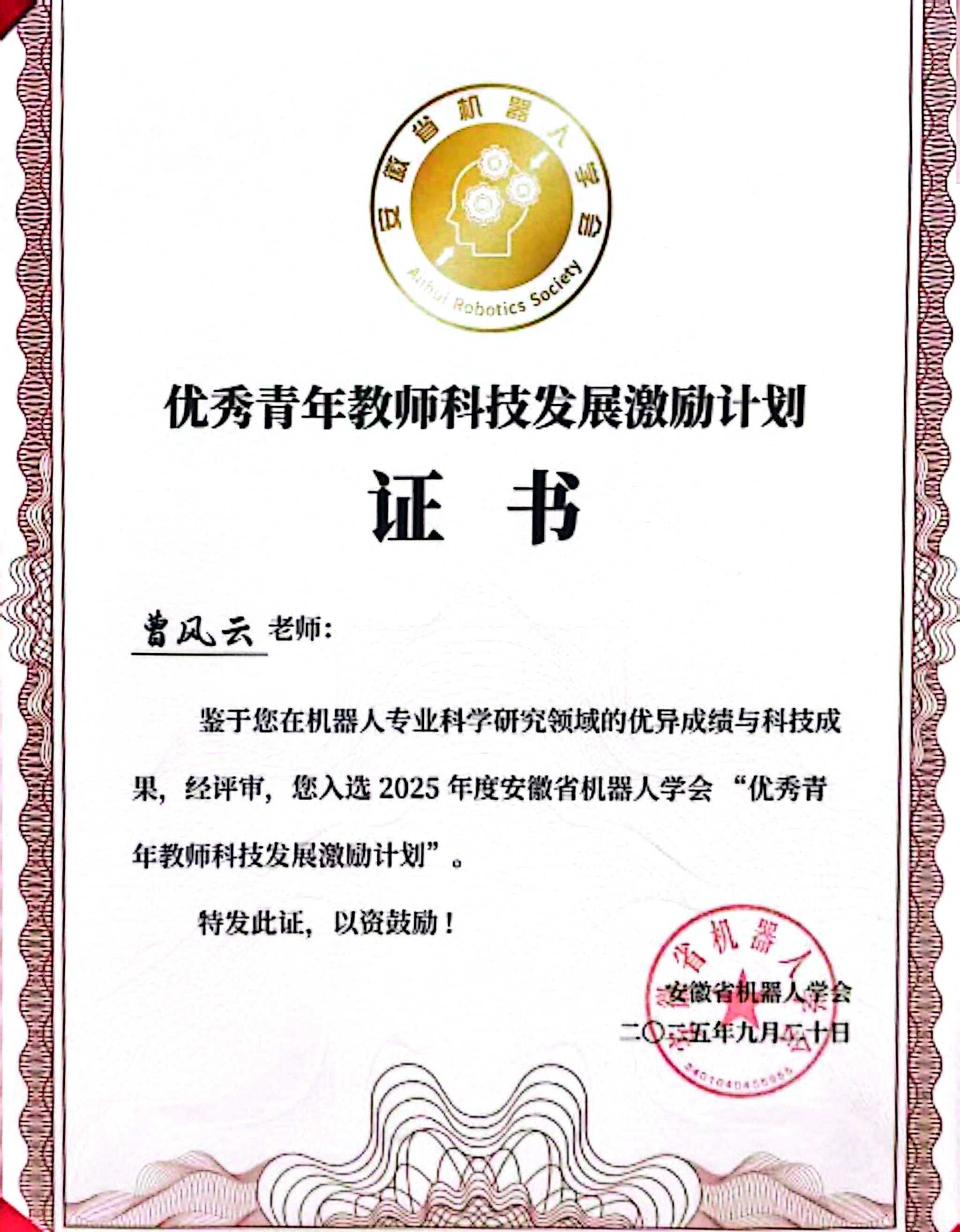 近日,第三届安徽省机器人大会暨智能机器人产业生态发展论坛在安徽工程大学召开,会上颁发了安徽省机器人学会2025年度奖励。2138CC太阳集团曹风云老师荣获优秀青年教师发展激励计划奖励。