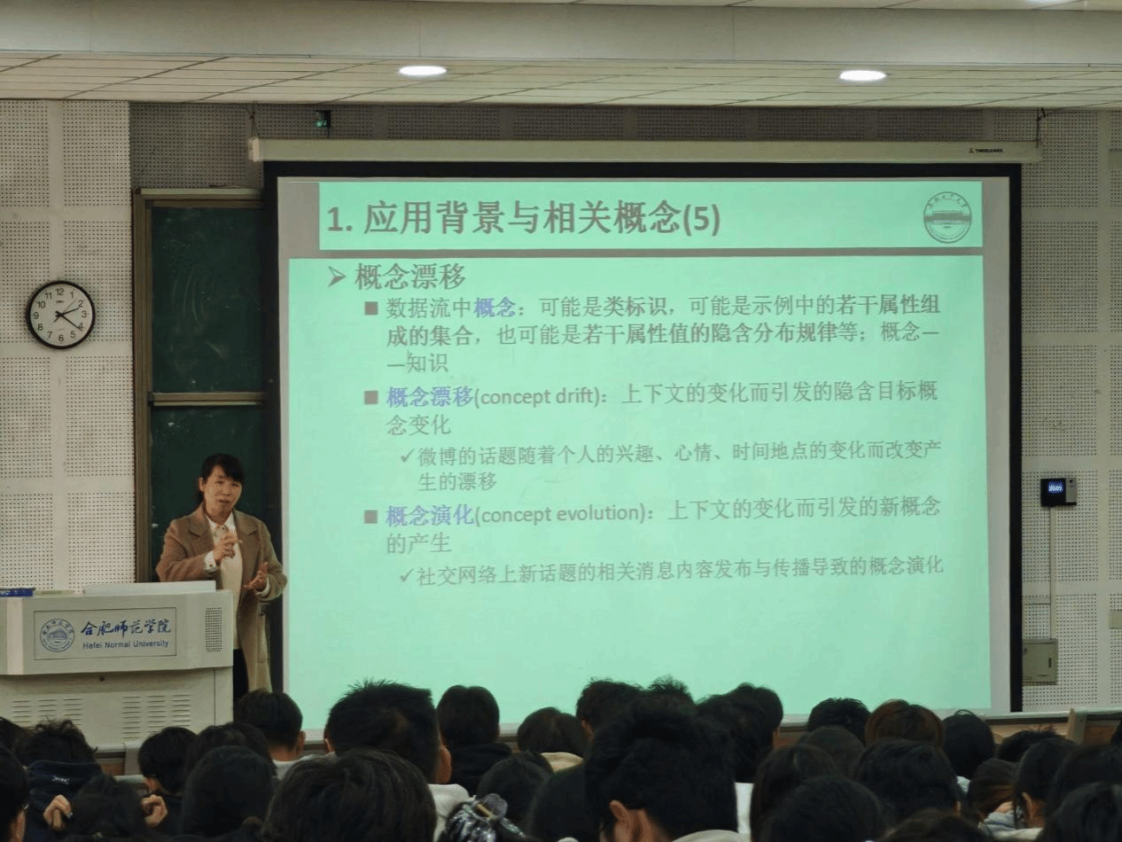 讲座伊始,李培培教授围绕数据流分类挖掘的学术前沿展开深度剖析。她先介绍了数据流的应用背景与核心概念,让在场同学对这一领域有了基础认知。随后,她重点阐述了数据流分类挖掘的挑战与研究成果,包括面向应用的数据流分类原型系统、多标签数据流分类、短文本数据流分类等方向,还详解了“概念漂移”的形式化定义,并对比了数据流与传统数据的差异,其专业且清晰的讲解,为师生们呈现了数据流挖掘领域的未来发展蓝图。