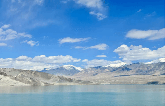 从喀什前往塔县,一路盘旋向西,进入帕米尔高原。车一转弯,看见路的尽头碧波浩渺,银沙璀璨,像一颗蓝色的宝石,镶嵌在高原上,远看湛蓝,近看翠绿如马代的湖泊,后面是一座座白沙山,绵延起伏,线条优美。